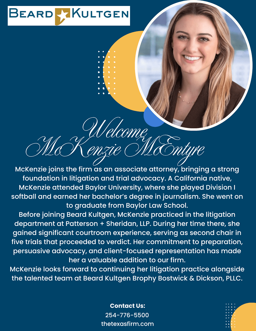 We’re excited to welcome McKenzie McEntyre to Beard Kultgen Brophy Bostwick & Dickson, PLLC as an associate attorney. McKenzie brings a strong background in litigation and trial advocacy, with experience from Patterson + Sheridan, LLP and a law degree from Baylor Law School.